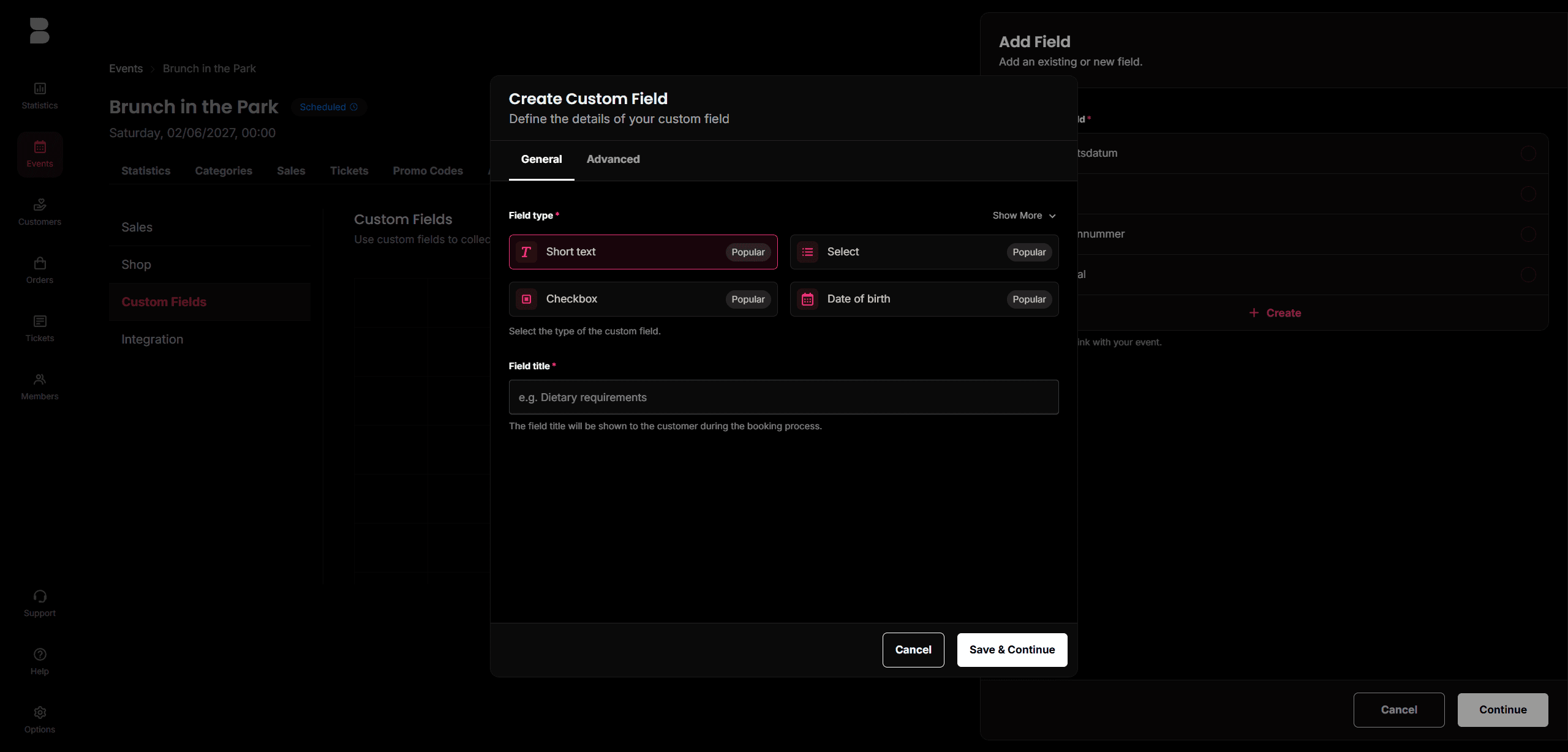 Benutzerdefinierte Felder – Sammle wertvolle Informationen über deine Gäste direkt im Checkout. Ob Essenswünsche, T-Shirt-Grössen oder Marketing-Abfragen: Erstelle individuelle Felder pro Ticket oder Bestellung mit verschiedenen Typen wie Text, Auswahl oder Datum.