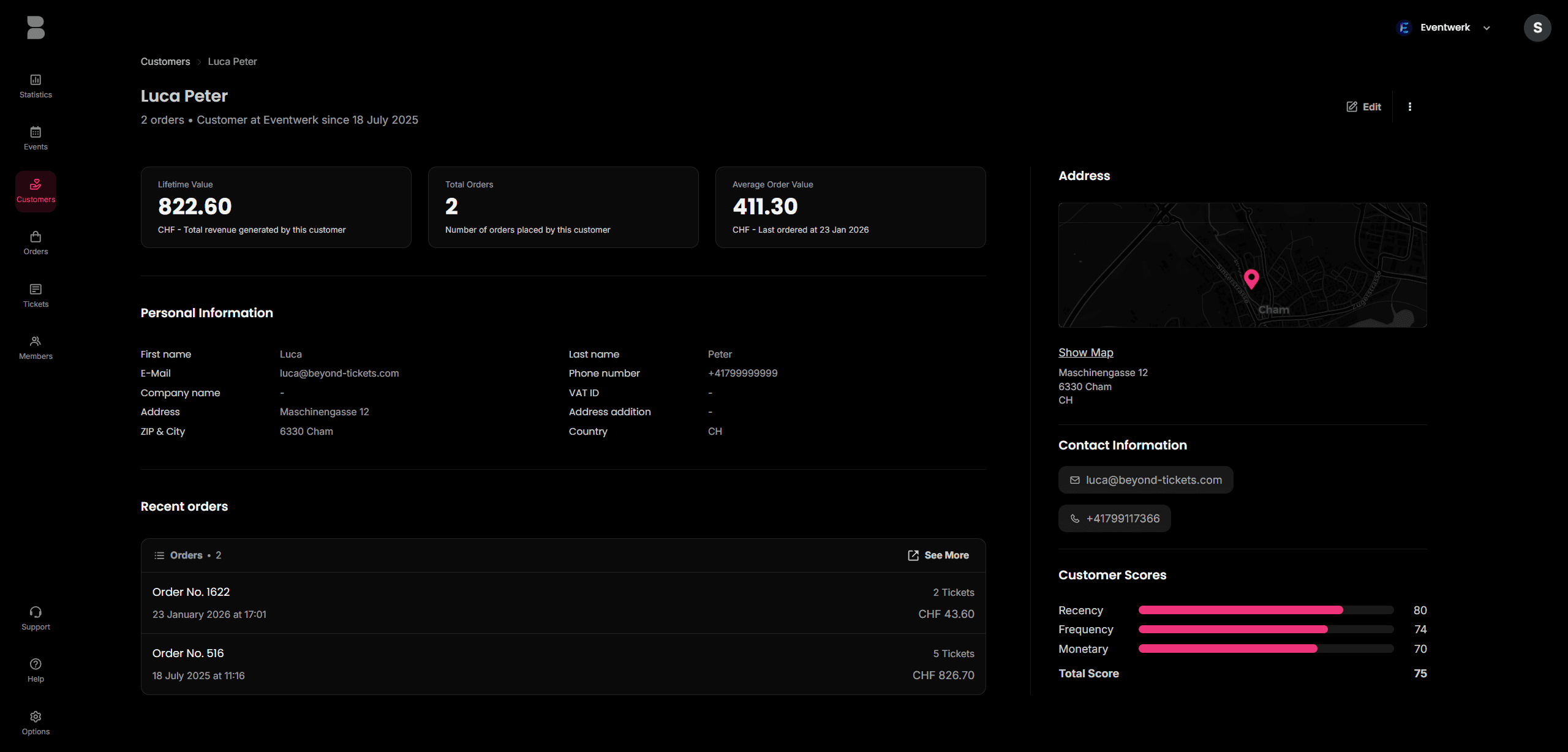 Integriertes CRM – Verwalte deine Kundendaten zentral und eventübergreifend. Mit Key Metrics wie Lifetime Value und Customer Scores (RFM) wird Beyond Tickets zu deinem mächtigen Dashboard für echte Gäste-Beziehungen.